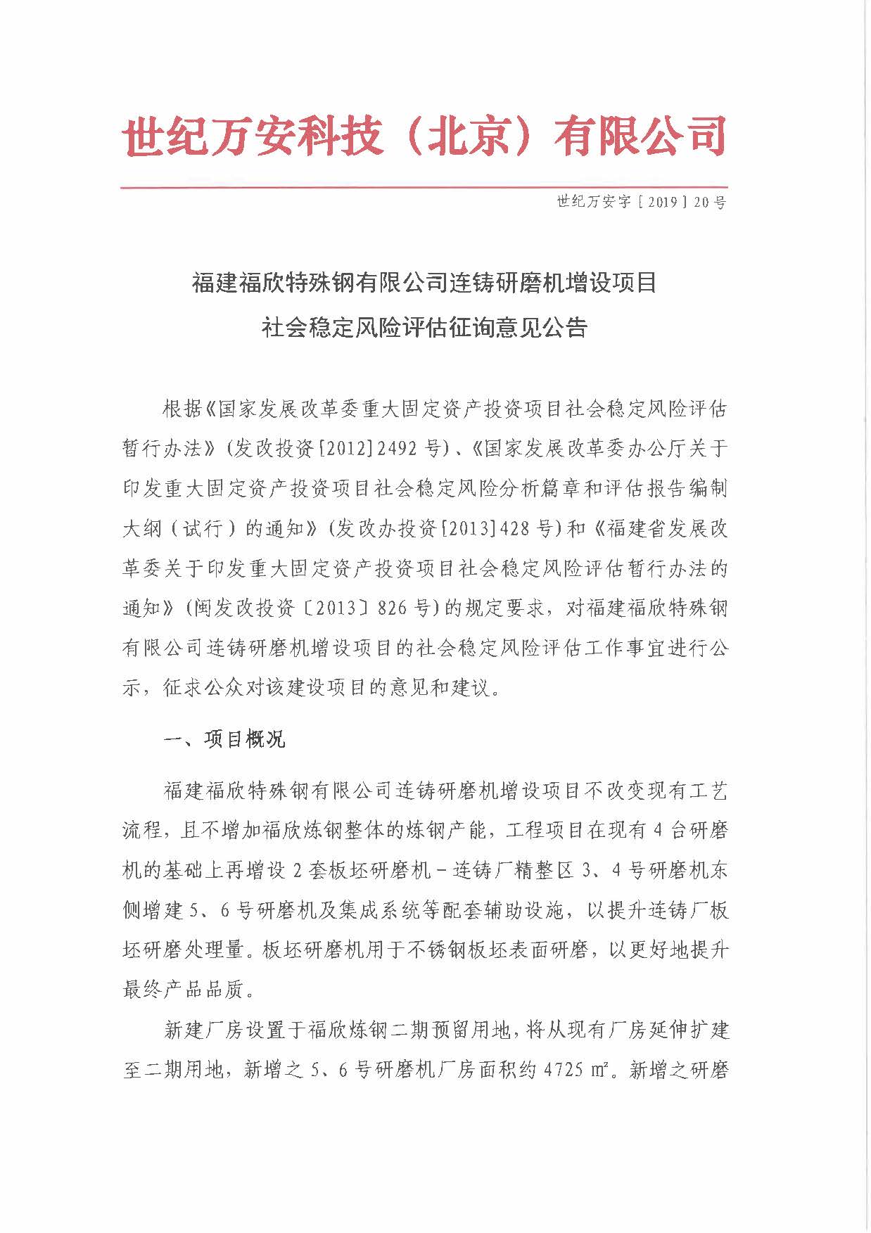 福建福欣特殊鋼有限公司連鑄研磨機增設項目 社會穩(wěn)定風險評估征詢意見公告