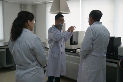 王會長在理化實(shí)驗(yàn)室聽取員工匯報(bào)操作規(guī)范要求